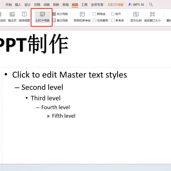 - 打开「视图」菜单,点击「幻灯片母版」进入编辑界面。