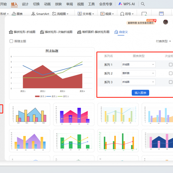 插入组合图表:打开PPT,依次点击“插入”→“图表”→“组合图”,根据实际需求选择所需的图表类型,例如折线图和面积图。