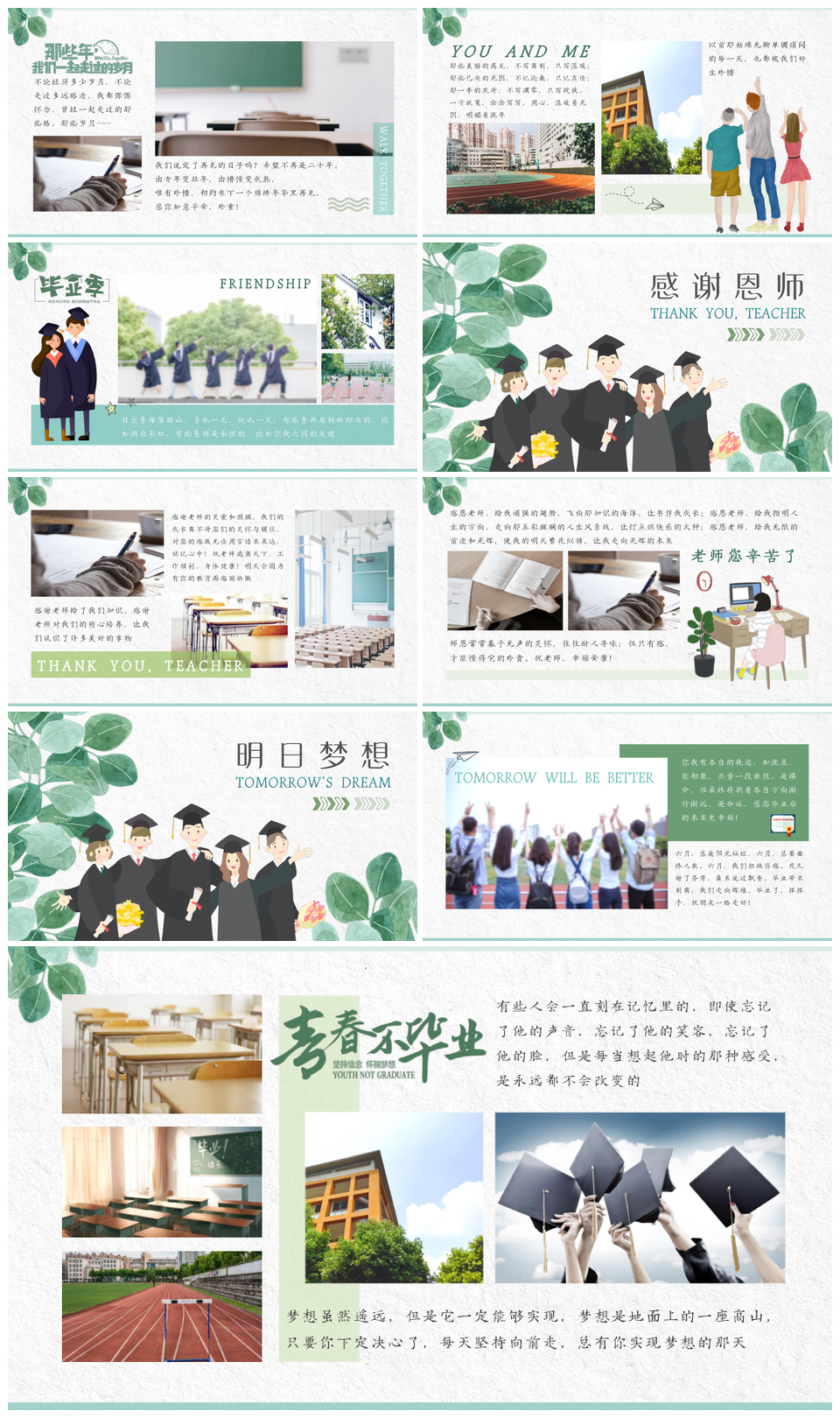 这是一张绿色青春校园毕业季班级聚会纪念相册PPT模板,包含绿色、青春、校园、毕业季、班级、聚会、纪念相册等主题内容,也可用作绿色青春校园毕业季、绿色青春校园相册、青春校园毕业季班级、校园毕业季班级聚会、毕业季班级聚会纪念、班级聚会纪念相册、绿色青春校园、青春校园毕业季、校园毕业季班级、毕业季班级聚会、班级聚会纪念、聚会纪念相册、绿色青春、绿色校园、青春校园、校园毕业季、毕业季班级、班级聚会、聚会纪念、纪念相册等PPT场景使用。