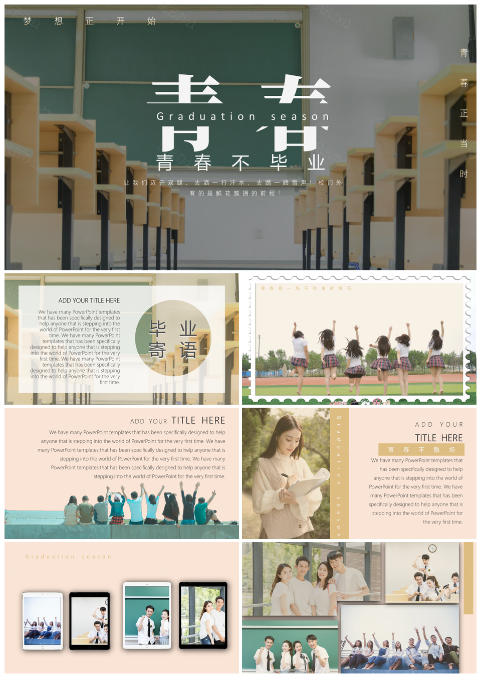 本站提供的彩色毕业季青春不散场纪念相册旅行相册PPT模板,下载格式为pptx,一共10页,作品中文字及图均可以修改和编辑,图片更改请在作品中右键图片并更换,文字修改请直接点击文字进行修改。