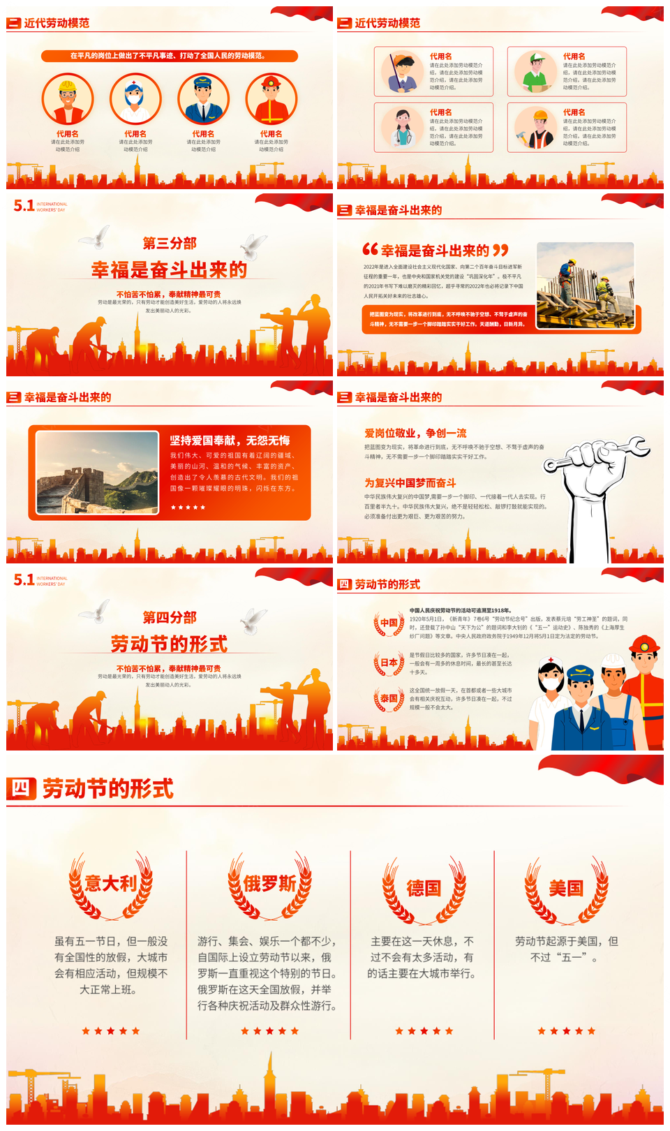 本站提供的五一劳动节节日PPT模板,下载格式为pptx,一共16页,作品中文字及图均可以修改和编辑,图片更改请在作品中右键图片并更换,文字修改请直接点击文字进行修改。