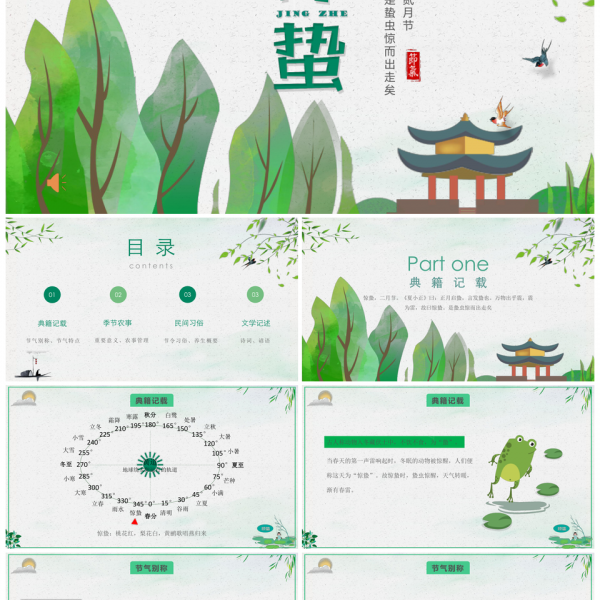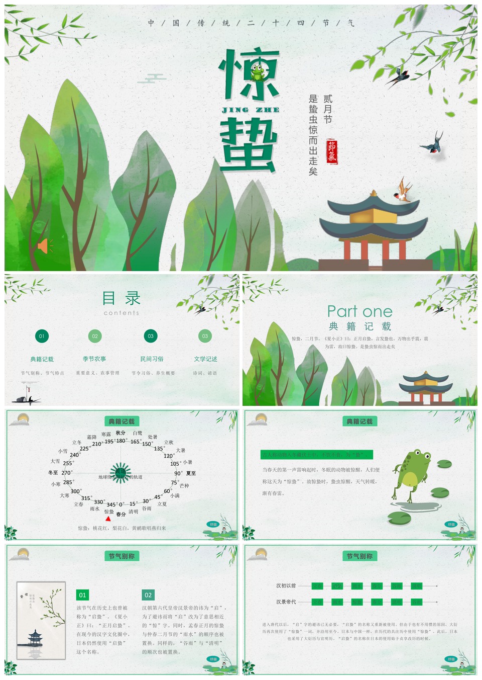 这是一张绿色小清新惊蛰节气习俗介绍PPT模板,包含绿色、小清新、惊蛰、节气、习俗、介绍等主题内容,也可用作惊蛰节气习俗介绍、绿色小清新惊蛰节气、惊蛰节气习俗、绿色小清新惊蛰、惊蛰节气、节气习俗、习俗介绍、绿色小清新、惊蛰习俗、小清新惊蛰等PPT场景使用。