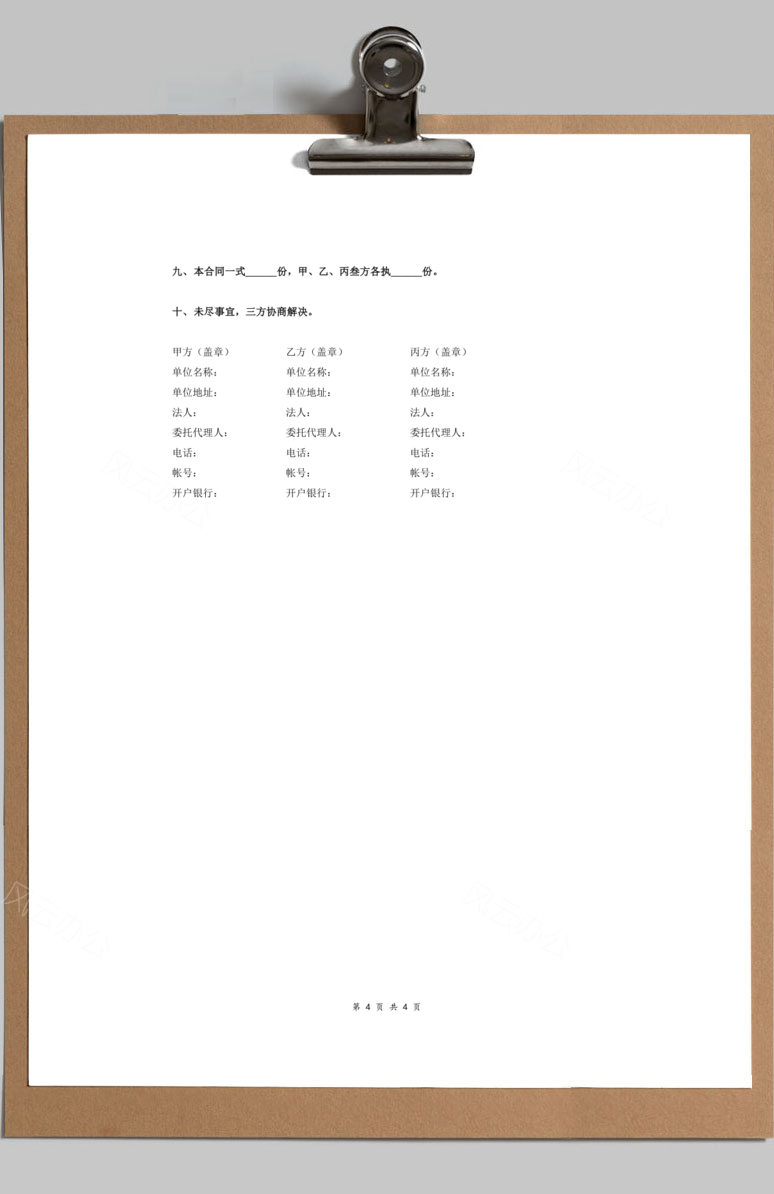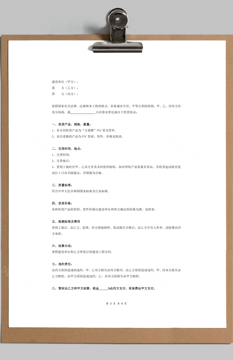 当前位置:首页>Word模板>合同协议>PVC管材、管件采购合同协议三方Word模板 PVC管材、管件采购合同协议三方Word模板 合同协议 5月21日 编辑 前往下载 admin 取消关注 关注 私信 本站提供PVC管材、管件采购合同协议三方Word模板下载,格式为 doc,一共3页,作品中文字及图均可以修改和编辑,图片更改请在作品中右键图片并更换,文字修改请直接点击文字进行修改。更多精彩合同协议Word模板,尽在本站。 下载权限查看 ¥ 免费下载 评论并刷新后下载 登录后下载 查看演示 {{attr.name}}: 您当前的等级为 登录后免费下载登录 小黑屋反思中,不准下载! 评论后刷新页面下载评论 支付¥以后下载 请先登录 您今天的下载次数(次)用完了,请明天再来 支付积分以后下载立即支付 支付以后下载立即支付 您当前的用户组不允许下载升级会员 您已获得下载权限 您可以每天下载资源次,今日剩余次 相关文章: 干拌砂浆采购合同协议Word模板 办公用品采购合同协议Word模板 白色惊蛰节气小清新PPT模板 五一劳动节主题节日宣传PPT模板 05 21 本站历史上的今天 2024:立体纸质便签PPT文本框素材 版权声明 站内部分内容由互联网用户自发贡献,该文观点仅代表作者本人。本站仅提供网络资源分享服务,不拥有所有权,不承担相关法律责任。如发现本站有涉嫌抄袭侵权/违法违规的内容, 请 联系我们 一经核实,立即删除。并对发布账号进行永久封禁处理。在为用户提供最好的产品同时,保证优秀的服务质量。 本站仅提供信息存储空间,不拥有所有权,不承担相关法律责任。 给TA打赏 共{{data.count}}人 人已打赏 三方管件采购合同协议