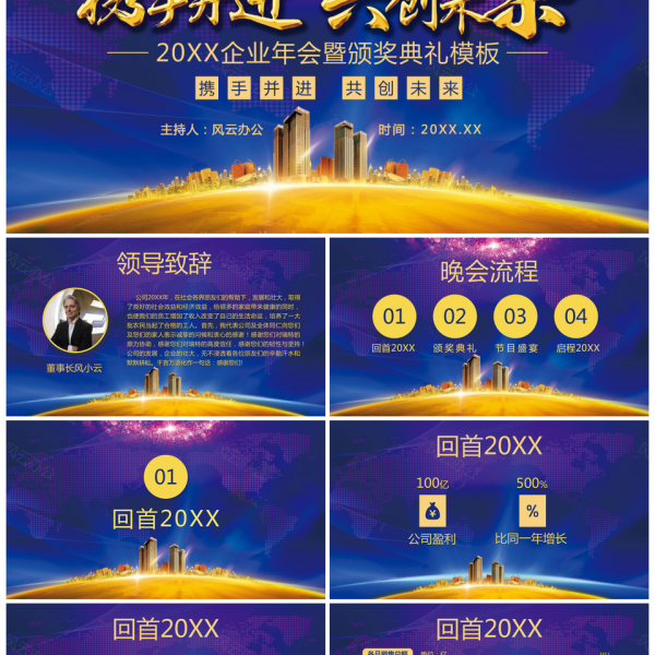 本站提供的企业年会暨颁奖盛典PPT模板,下载格式为pptx,一共15页,作品中文字及图均可以修改和编辑,图片更改请在作品中右键图片并更换,文字修改请直接点击文字进行修改。