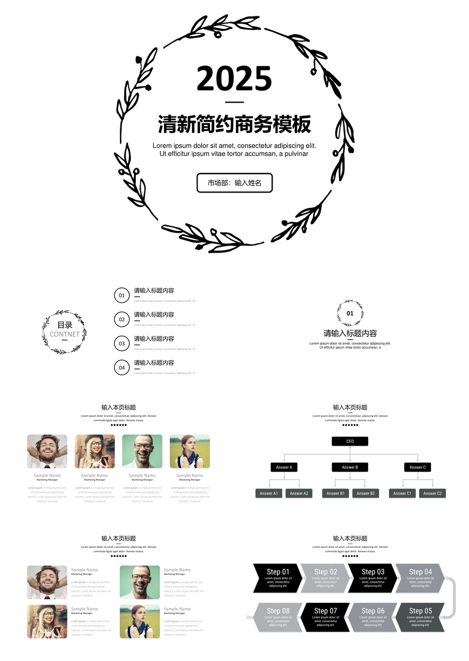 本站提供的2025黑白小清新时尚花环主题通用商务PPT模板,下载格式为pptx,一共47页,作品中文字及图均可以修改和编辑,图片更改请在作品中右键图片并更换,文字修改请直接点击文字进行修改。