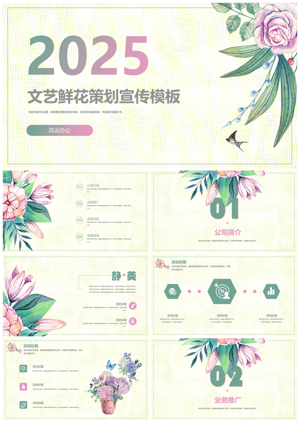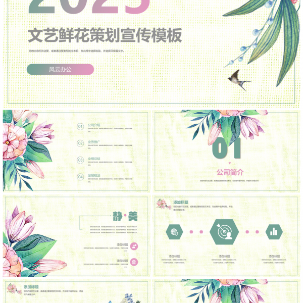 本站提供的2025彩色文艺创意鲜花公司介绍路演PPT模板,下载格式为pptx,一共19页,作品中文字及图均可以修改和编辑,图片更改请在作品中右键图片并更换,文字修改请直接点击文字进行修改。