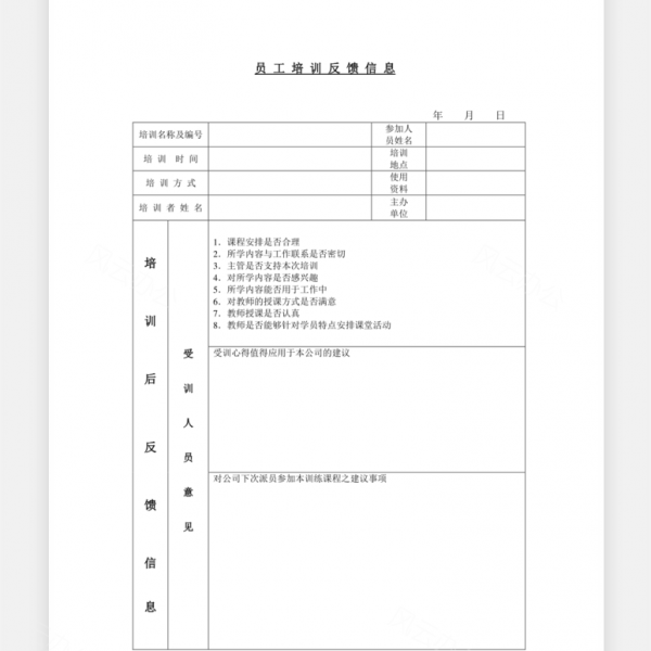 本站提供人事员工培训反馈信息Word模板下载,格式为 word,一共1页,作品中文字及图均可以修改和编辑,图片更改请在作品中右键图片并更换,文字修改请直接点击文字进行修改。更多精彩人力资源Word模板,尽在本站。