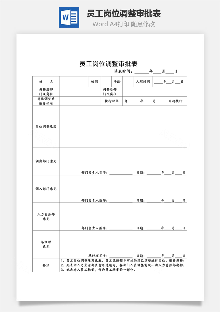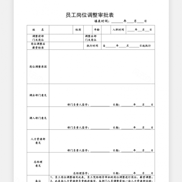 当前位置:首页>Word模板>企业管理>员工岗位调整审批表Word模板 员工岗位调整审批表Word模板 企业管理 5月21日 编辑 前往下载 admin 取消关注 关注 私信 本站提供员工岗位调整审批表Word模板下载,格式为 word,一共1页,作品中文字及图均可以修改和编辑,图片更改请在作品中右键图片并更换,文字修改请直接点击文字进行修改。更多精彩人力资源Word模板,尽在本站。 下载权限查看 ¥ 免费下载 评论并刷新后下载 登录后下载 查看演示 {{attr.name}}: 您当前的等级为 登录后免费下载登录 小黑屋反思中,不准下载! 评论后刷新页面下载评论 支付¥以后下载 请先登录 您今天的下载次数(次)用完了,请明天再来 支付积分以后下载立即支付 支付以后下载立即支付 您当前的用户组不允许下载升级会员 您已获得下载权限 您可以每天下载资源次,今日剩余次 相关文章: 员工职位升降岗位薪资审批表Word模板 员工转正审批Word模板 岗位说明书大全Word模板 HR必备员工离职面谈样题Word模板 05 21 本站历史上的今天 2024:立体纸质便签PPT文本框素材 版权声明 站内部分内容由互联网用户自发贡献,该文观点仅代表作者本人。本站仅提供网络资源分享服务,不拥有所有权,不承担相关法律责任。如发现本站有涉嫌抄袭侵权/违法违规的内容, 请 联系我们 一经核实,立即删除。并对发布账号进行永久封禁处理。在为用户提供最好的产品同时,保证优秀的服务质量。 本站仅提供信息存储空间,不拥有所有权,不承担相关法律责任。 给TA打赏 共{{data.count}}人 人已打赏 员工审批岗位调整