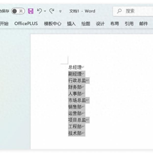 在Word文档输入架构图文字。“总经理” 不缩进,选中其余文字,按Tab键缩进1格。之后按组织架构等级,依此对各层级文字按Tab键缩进,让文字呈现清晰层级关系。