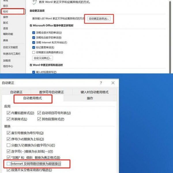 - 在自动更正设置窗口,切换到 “自动格式” 和 “键入时自动套用格式” 选项卡,取消勾选 “Internet及网络路径替换为超链接”,最后点击 “确定”。从此,输入网址和邮箱就不会自动变成超链接了。