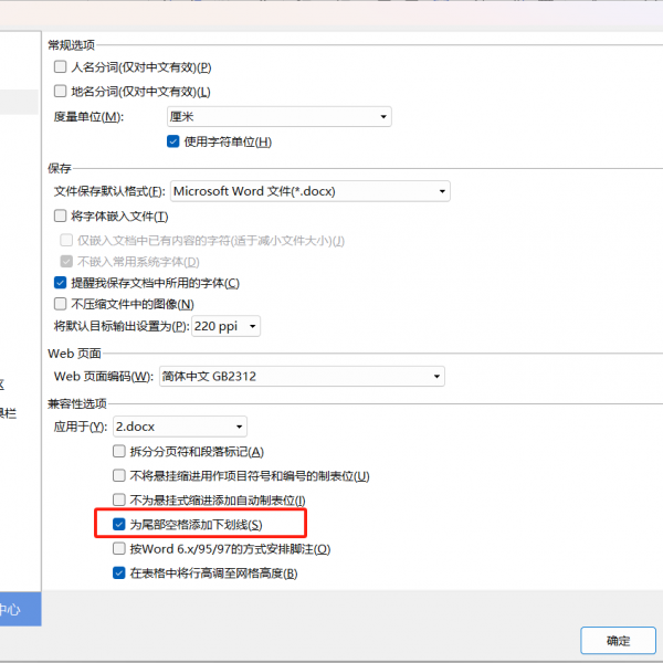 在「兼容选项」板块中,仔细查找并勾选「为尾部空格添加下划线」这一选项。勾选完成后,点击窗口下方的「确定」按钮保存设置。这一操作的原理是让文档将空格视为有效字符,从而让下划线能够连贯地覆盖所有输入区域。
