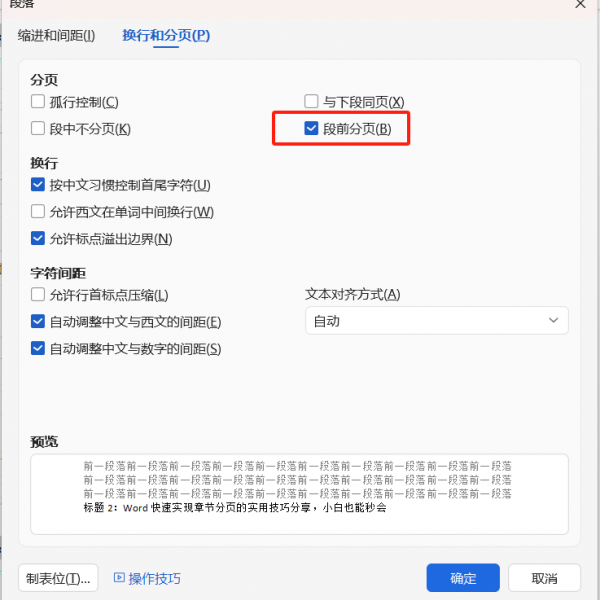 - 选择完成后,将鼠标悬停在选中文字的灰色区域上,点击鼠标右键,在弹出的菜单中选择“段落”。随后进入“换行和分页”选项卡,勾选“段前分页”,最后点击“确定”。