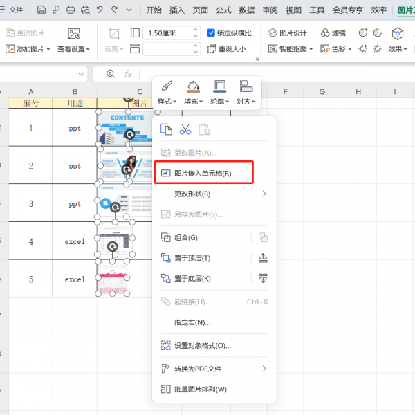 - 切换嵌入模式:右键点击选中的图片,选择“切换为嵌入单元格图片”,完成设置。