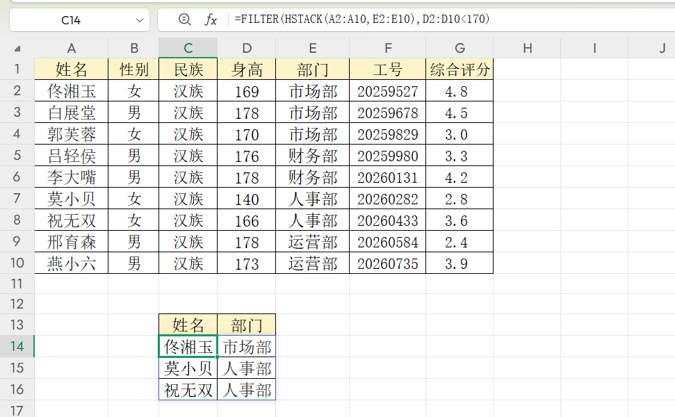 用FILTER添加条件:=FILTER(上述HSTACK结果,身高列区域<170)