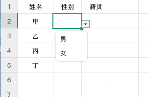 当下拉选项较少(如“男”“女”),可以使用 Excel 自带的数据验证功能直接输入。