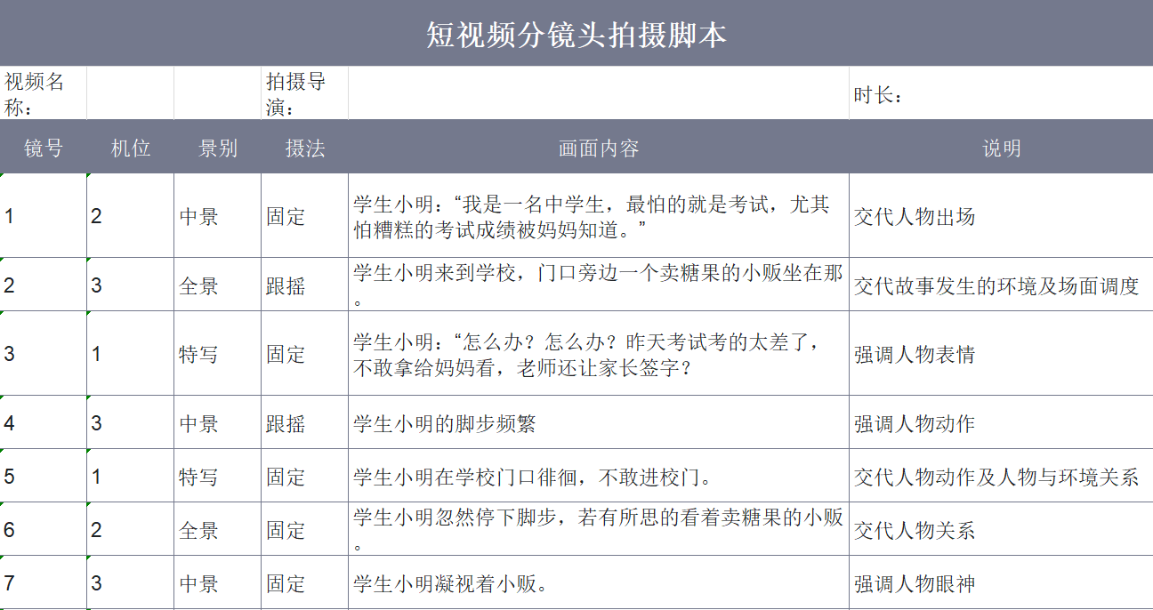 整合拍摄场景、景别、技巧、时长等信息,规范短视频分镜制作流程。