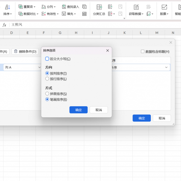5.确认排序规则:点击确定后,系统将自动按照“首字笔画数→笔顺(横竖撇捺折)→内码兜底”的规则排序。