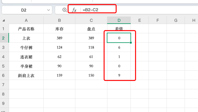 若你需要精确了解每项差异有多大,可在新列中输入以下公式: