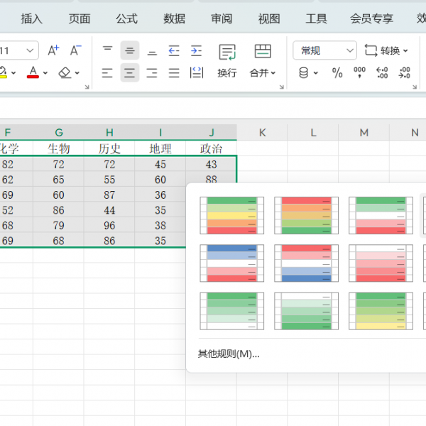 如果只需要突出某一关键区间的数据,三色刻度就显得过于复杂了。这时,双色刻度色阶图能帮你聚焦重点。比如在成绩分析中,只想关注不及格的学生,可选择“白绿色阶-双色刻度”,设置最小值为59.9、最大值为60。这样一来,低于60分的单元格会自动填充绿色,其他分数则保持默认格式,让关键数据一目了然。