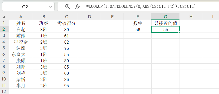 通过ABS计算数值与56的差值绝对值,FREQUENCY会定位差值最小的位置,最终返回对应数值。