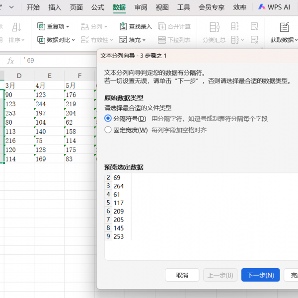 选中目标文本型数字区域,点击菜单栏中的“数据”选项,选择“分列”功能,无需进行额外设置,直接点击“完成”即可。该方法利用分列功能的格式转换特性,自动将文本型数字转换为可运算的数值。