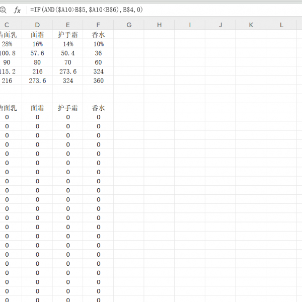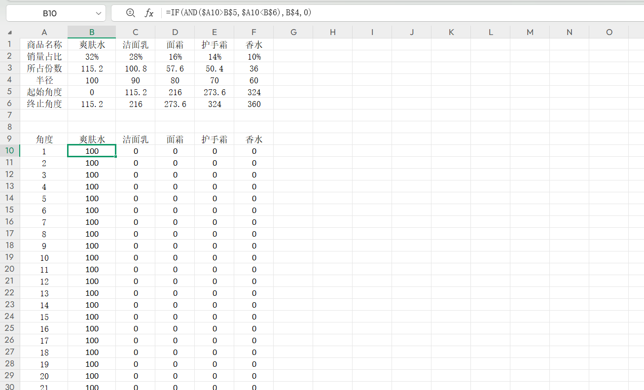 4.最后在表格下方制作辅助表,第一列输入1到360的数字,第二列第一个单元格输入公式“=IF(AND($A10>B$5,$A10<B$6),B$4,0)”,并将公式向下复制360行,向右复制到对应的数据列,辅助表就制作完成了。