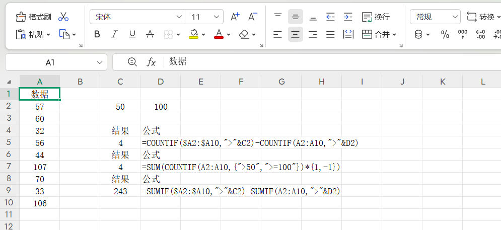 或数组公式(按Ctrl+Shift+Enter):=SUM(COUNTIF(A2:A10,{“>50″,”>=100″})*{1,-1}),结果均为4。