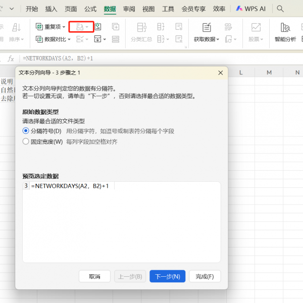 2.选择【分隔符号】,勾选右侧【其他】,在输入框填入关键字作为分隔符,点击【完成】,即可将数据按设定关键字拆分为两列。