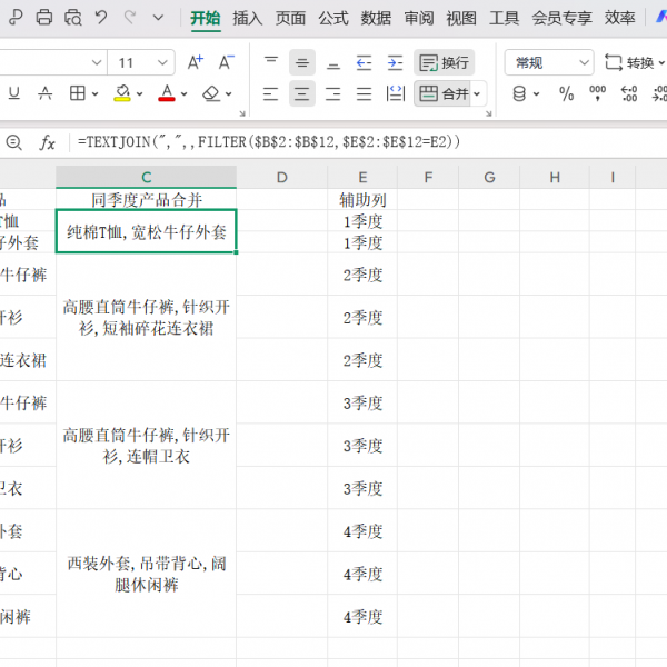 3.筛选并合并产品:使用公式=TEXTJOIN(“,”,,FILTER($B$2:$B$12,$E$2:$E$12=E2)),筛选出同季度产品并合并,下拉填充公式后,再用格式刷将G列格式还原到C列。