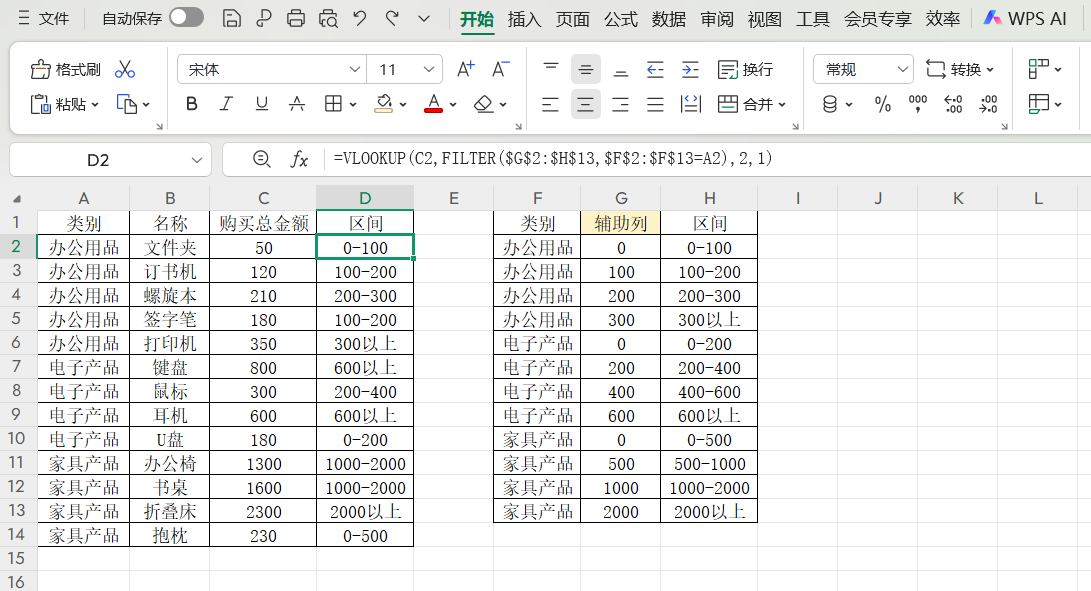 获取对应类别区间数据后,用VLOOKUP近似匹配得商品价格所属区间,公式:=VLOOKUP(C2,FILTER($G$2:$H$13,$F$2:$F$13=A2),2,1)(低版本可将FILTER替换为OFFSET公式)。VLOOKUP近似匹配的优势是,找不到与商品价格(H2单元格)完全一致的数值时,会返回小于该价格的最大值对应的区间,确保商品精准匹配区间。