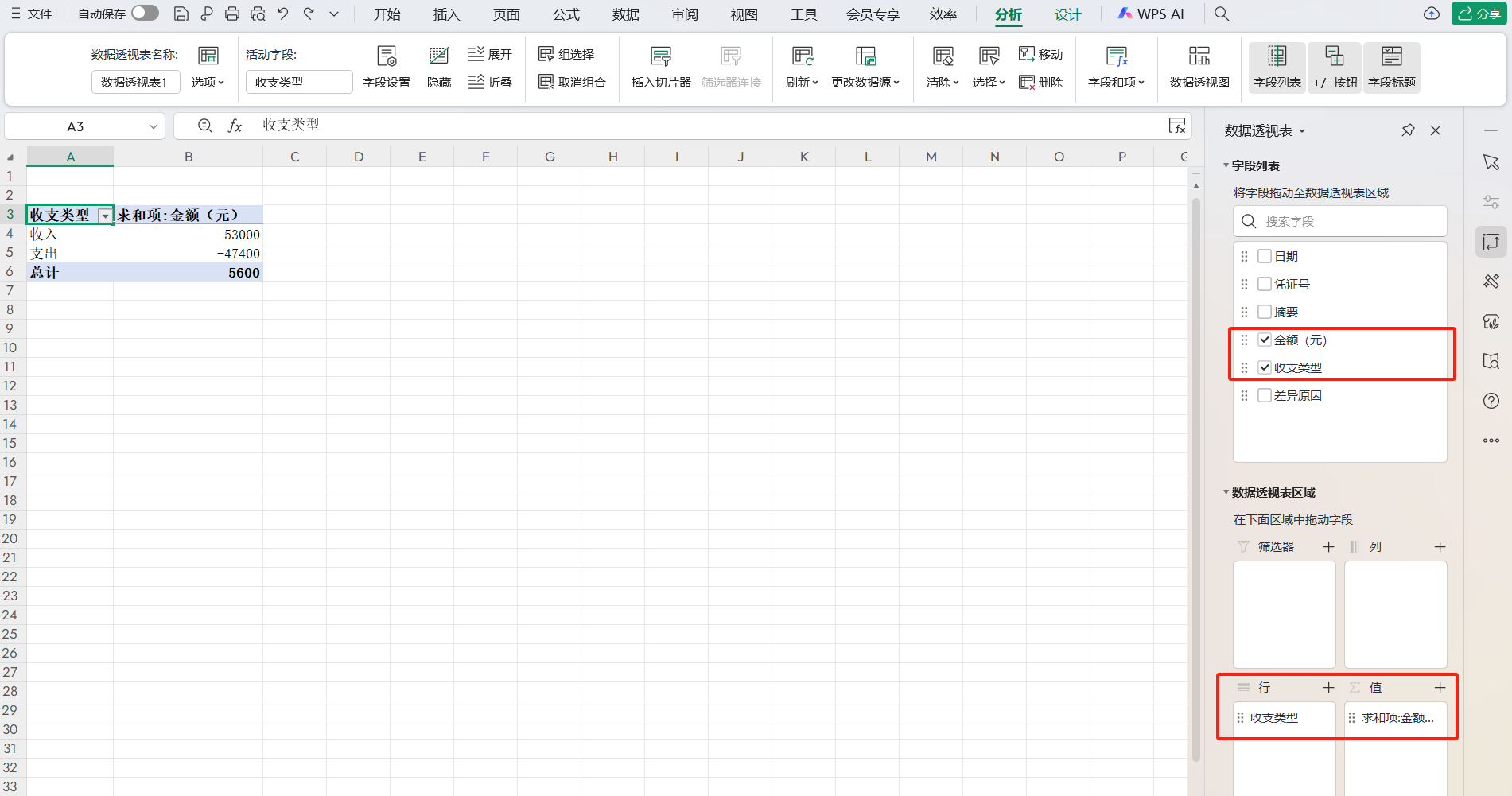 5.配置字段面板:在右侧“数据透视表字段”中,将“收支类型”拖到【行】区域,“金额”拖到【值】区域(默认求和,正好统计总金额)。