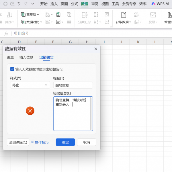 2.切换到“出错警告”选项卡,填写警告标题(如“编号重复”)和说明内容,点击“确定”。之后若录入重复编号,会自动弹出警告对话框。