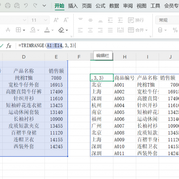 - 冒号前后都加“.”(如A1.:.E14):等同于=TRIMRANGE(A1:E14,3,3),删除所有方向的空单元格。