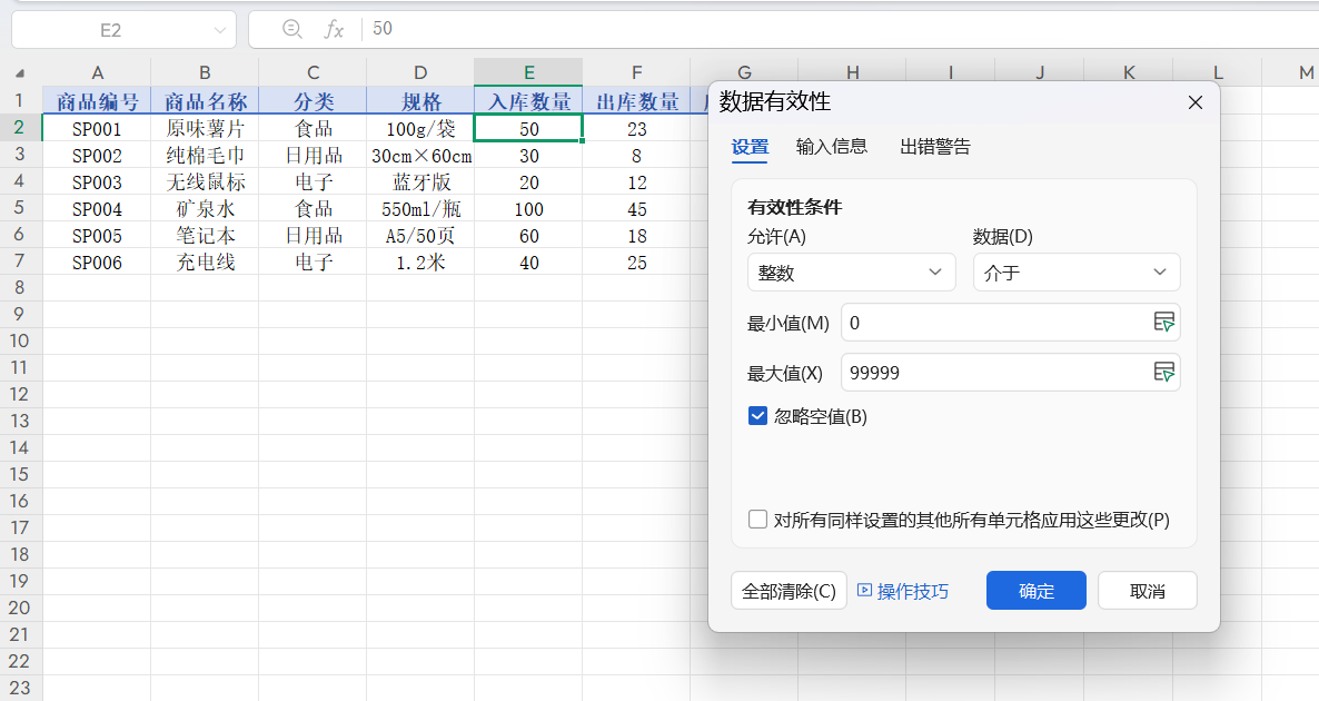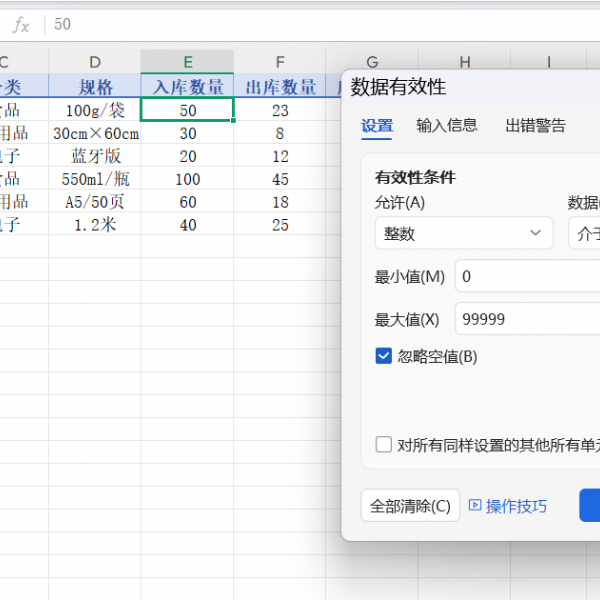 2.设置数据验证:选中商品分类,“数据-有效性”,选择“序列”并输入分类,生成下拉菜单;选中数量列,同样设置有效性,允许“整数”且最小值为0,避免无效输入。