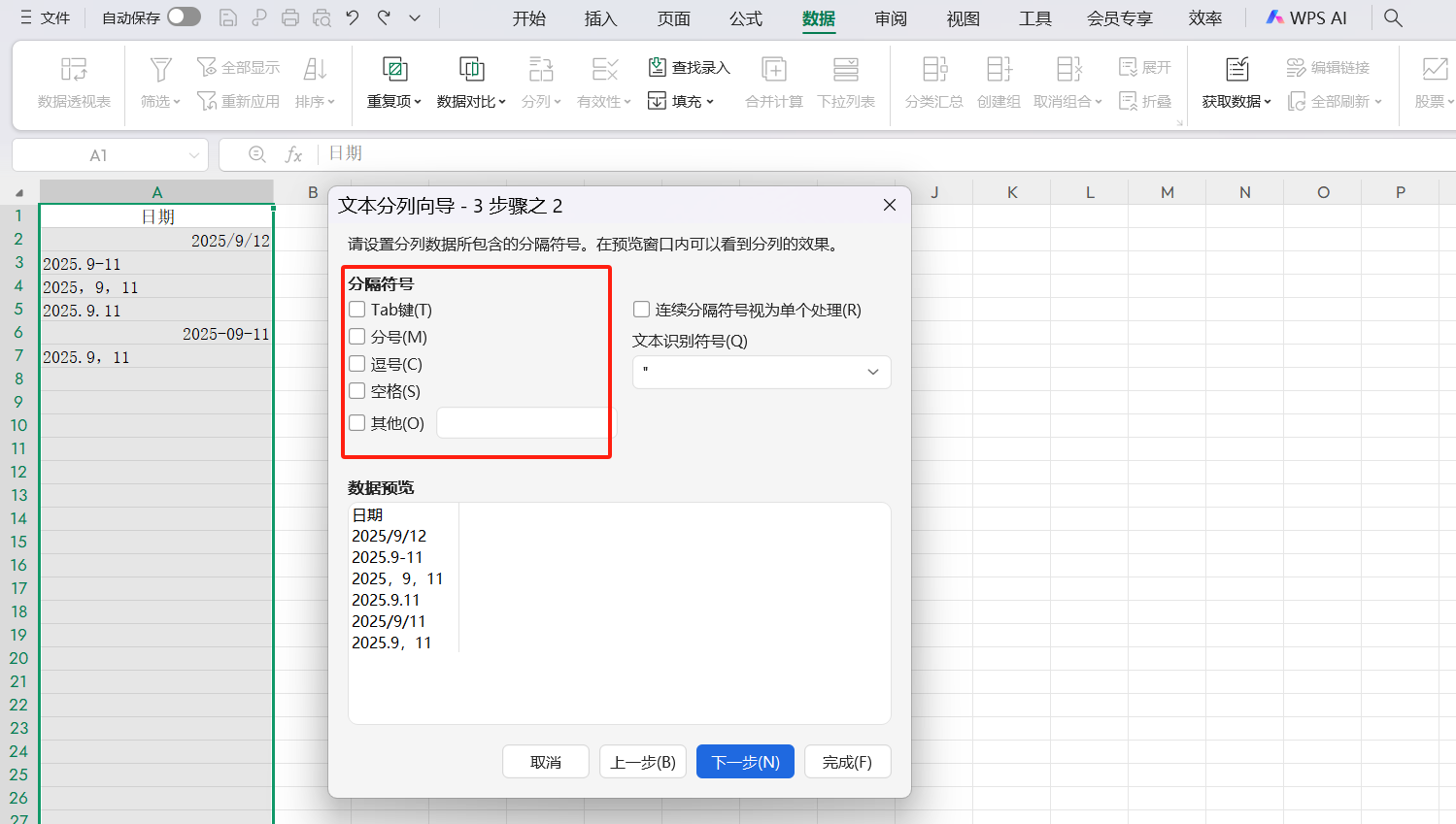1.启动分列功能:选中混乱日期列(如A列),点击顶部【数据】选项卡,选择【分列】,弹出对话框后直接点【下一步】(默认“分隔符号”选项);