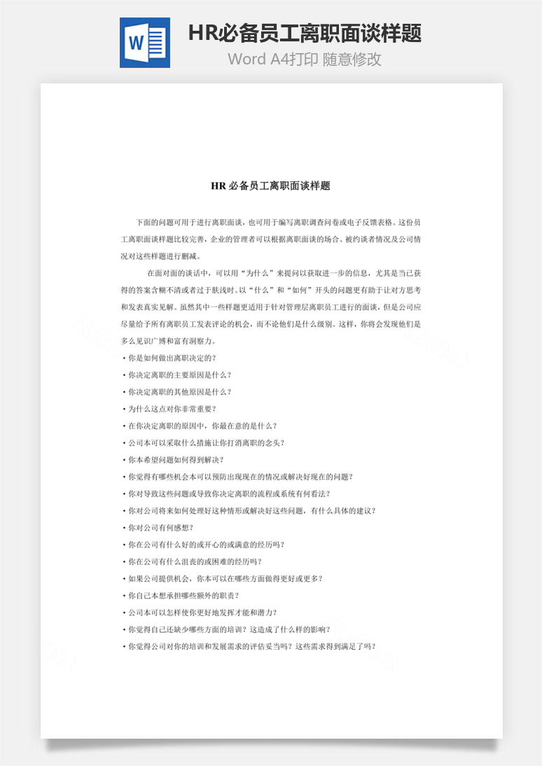当前位置:首页>Word模板>企业管理>HR必备员工离职面谈样题Word模板 HR必备员工离职面谈样题Word模板 企业管理 5月10日 编辑 前往下载 admin 取消关注 关注 私信 本站提供HR必备员工离职面谈样题Word模板下载,格式为 word,一共1页,作品中文字及图均可以修改和编辑,图片更改请在作品中右键图片并更换,文字修改请直接点击文字进行修改。更多精彩人力资源Word模板,尽在本站。 下载权限查看 ¥ 免费下载 评论并刷新后下载 登录后下载 查看演示 {{attr.name}}: 您当前的等级为 登录后免费下载登录 小黑屋反思中,不准下载! 评论后刷新页面下载评论 支付¥以后下载 请先登录 您今天的下载次数(次)用完了,请明天再来 支付积分以后下载立即支付 支付以后下载立即支付 您当前的用户组不允许下载升级会员 您已获得下载权限 您可以每天下载资源次,今日剩余次 相关文章: 员工离职手续办理规定Word模板 中小企业管理员工考核表Word模板 员工岗位调整审批表Word模板 员工转正标准及流程Word模板 05 10 本站历史上的今天 2024:跷跷板对比PPT图形素材2024:16个精彩创意PPT结束语模板 版权声明 站内部分内容由互联网用户自发贡献,该文观点仅代表作者本人。本站仅提供网络资源分享服务,不拥有所有权,不承担相关法律责任。如发现本站有涉嫌抄袭侵权/违法违规的内容, 请 联系我们 一经核实,立即删除。并对发布账号进行永久封禁处理。在为用户提供最好的产品同时,保证优秀的服务质量。 本站仅提供信息存储空间,不拥有所有权,不承担相关法律责任。 给TA打赏 共{{data.count}}人 人已打赏 员工必备样题离职面谈