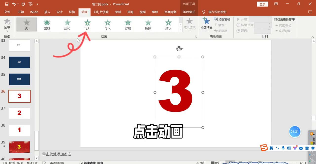现在来设置动画效果,同样选中它,点击 “动画” 选项,选择 “飞入” 效果。在 “效果选项” 中,选取 “自左上部”,将其设置为 “与上一动画同时”,持续时间设定为 0.5 秒。因为每一页的时间是一秒钟,所以持续时间不能超过一秒。