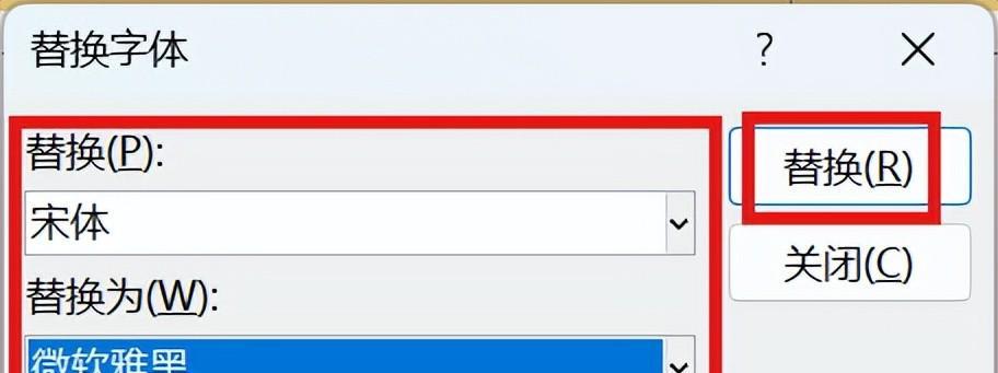 在弹出的对话框中,“替换” 处选择原使用的字体,也就是需要被替换的宋体。“替换为” 处选择最终想要的字体,即微软雅黑。通过明确这两个选项,我们确定了字体替换的方向。