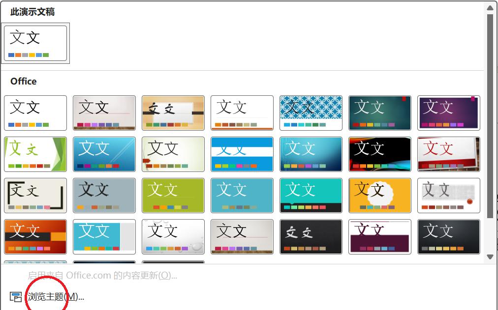 PPT 的 “主题” 实际上就是 PPT 模板,它能够一键将原本白底黑字的 PPT 更换背景,使其更加美观和专业。如果想要导入其他模板,可以单击 “浏览主题” 按钮,然后在文件浏览器中选择所需的模板文件进行导入。