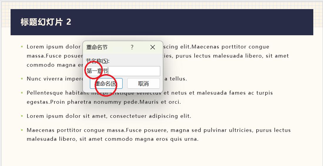 - 在“节名称”文本框中输入合适的名称,以便清晰地标识该组内容。完成输入后单击“重命名”进行确认。如果后续不需要某个节了,只需右击节内容,然后单击“删除节”即可。