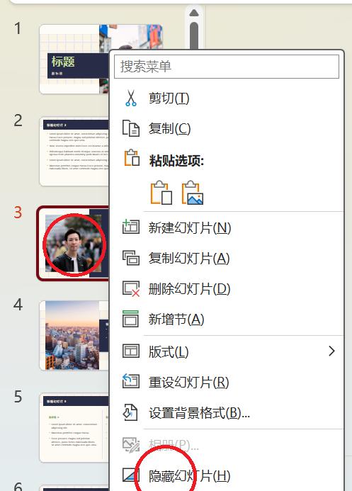 - 在幻灯片左侧缩览图中选中暂时不需要演讲的幻灯片,单击鼠标右键。