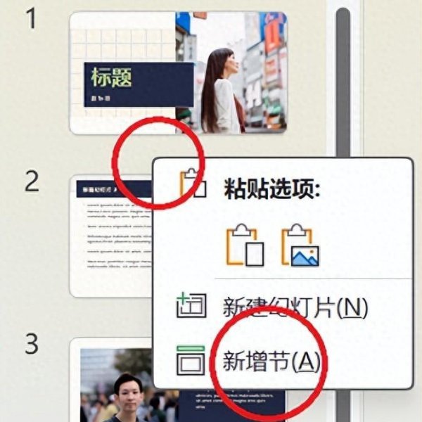 - 在幻灯片左侧缩略图中,确定要进行分组的幻灯片位置,在其上方单击鼠标右键。