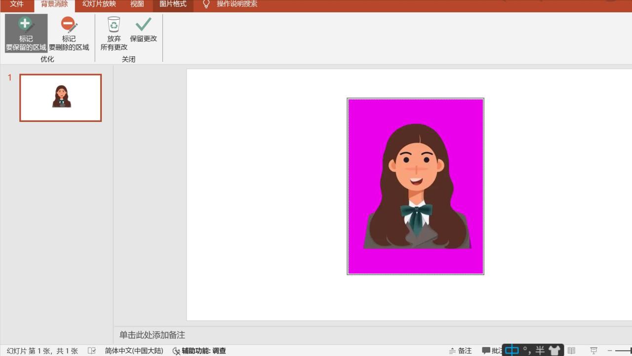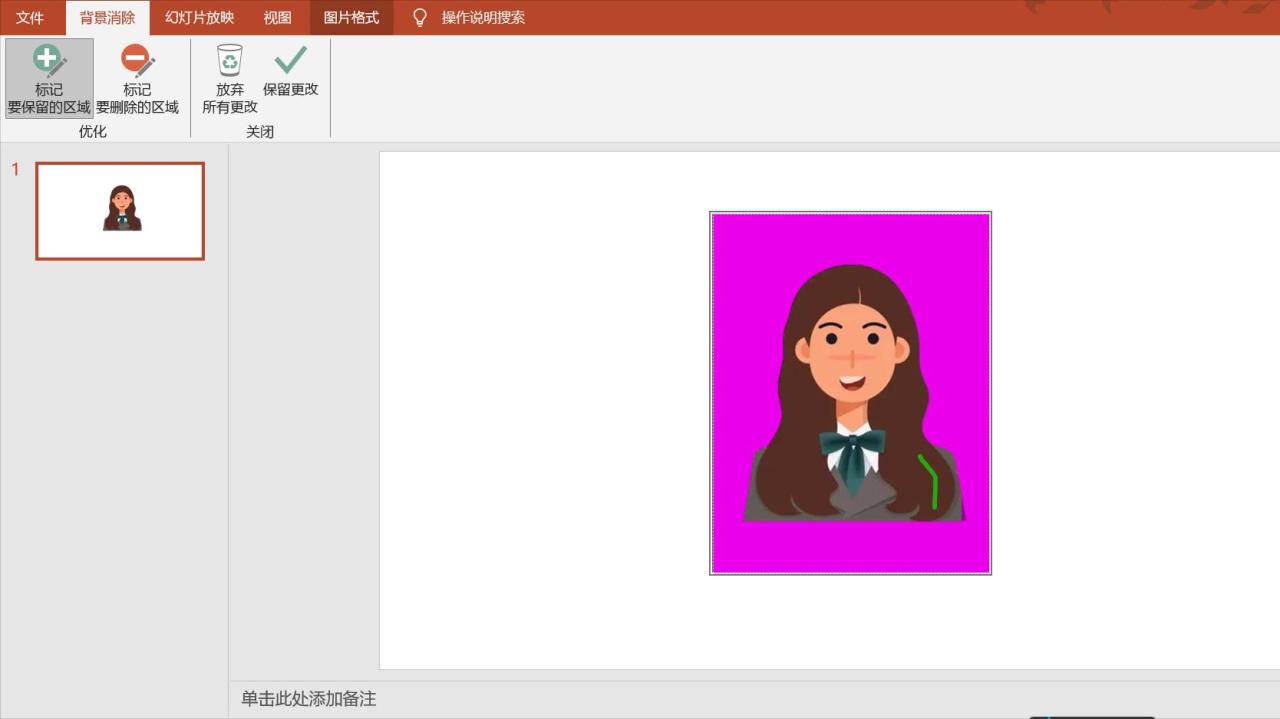当看到需要保留的地方都已经是正常颜色显示,且人像部分被准确标记出来后,就点击“保留更改”按钮。这样,照片的原始背景就被删除掉了,此时照片的背景通常会变成白色,为后续设置我们想要的背景色做好了准备。
