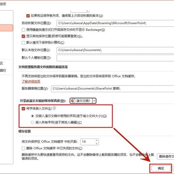 进入 “保存” 功能区域后,我们要在该区域显示的众多设置选项中,往下拉动滚动条,找到 “将字体嵌入文件” 这一选项,然后在它前面的勾选框里打上勾,表示我们选择启用字体嵌入的功能。勾选完成后,最后点击 “确定” 按钮,这样操作下来,当我们再次保存PPT文件时,相应的字体就会一同被嵌入到文件当中了。以后无论是将PPT保存到其他位置,还是分享给其他人,只要对方打开这个PPT文件,就能正常显示我们原本所设置的字体,避免了因字体缺失而造成的排版混乱等问题,确保了PPT的展示效果能够保持一致,与我们制作时的预期相符。