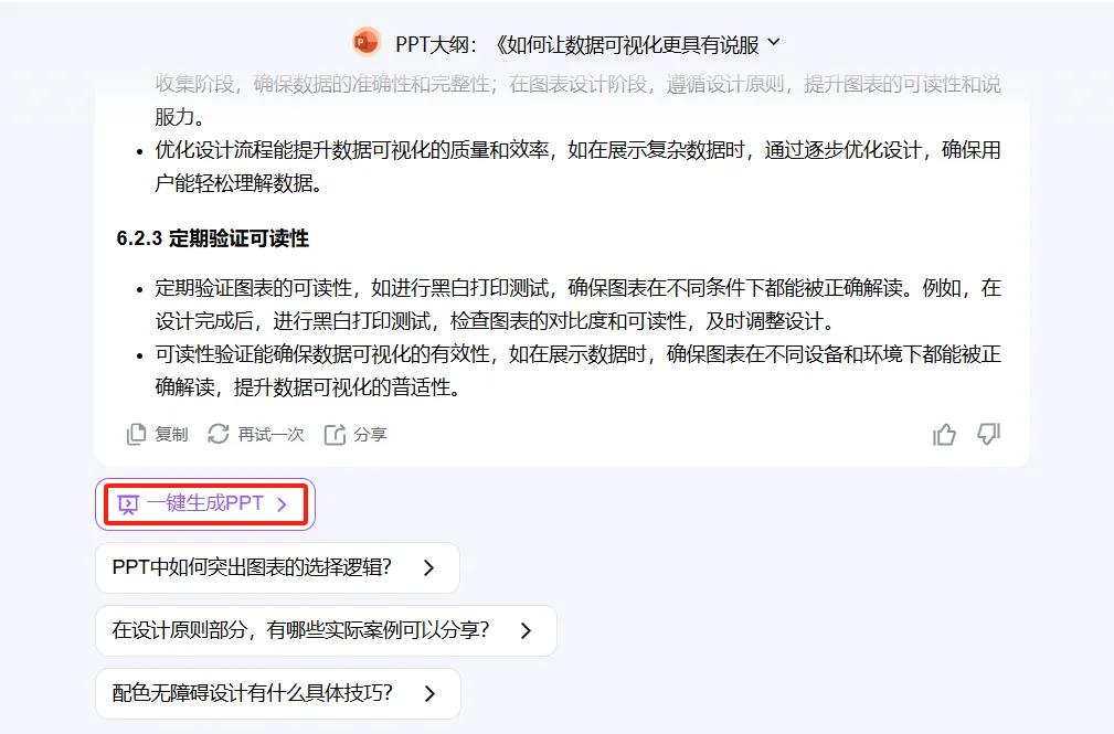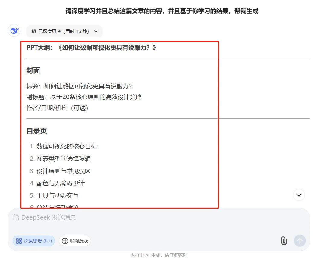 1、使用 DeepSeek 生成 PPT 大纲:首先,打开 DeepSeek 官网,开启与它的智能对话。在这里,我们向 DeepSeek 提出需求,让它为我们生成一个关于数据可视化内容的简要 PPT 大纲,标题设定为《如何让数据可视化更具有说服力?》,并且要求大纲符合课件标准,文字富有说服力。DeepSeek 迅速响应,凭借其强大的算法和智能分析能力,快速生成一份高质量的 PPT 大纲。完成后,我们只需轻松复制这份大纲,为下一步操作做好准备。