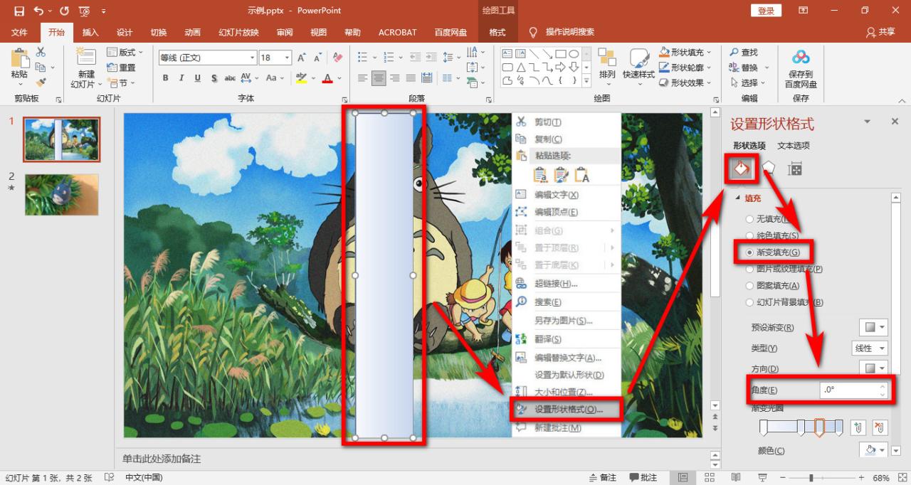 2、设置渐变填充:在 “设置形状格式” 窗格中,选择 “填充与线条”,然后点击 “渐变填充”。将渐变的角度改为 0°,确保渐变方向符合我们的需求。