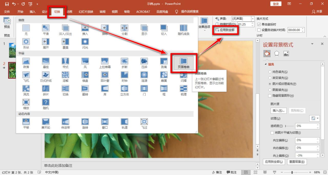 2、应用页面卷曲效果:切换到 “切换” 选项卡,在 “切换到此幻灯片” 区域中,选择 “华丽” 类别下的 “页面卷曲” 效果。接着,在 “计时” 功能区中,点击 “应用到全部”,这样所有幻灯片都将应用这一翻书切换效果。
